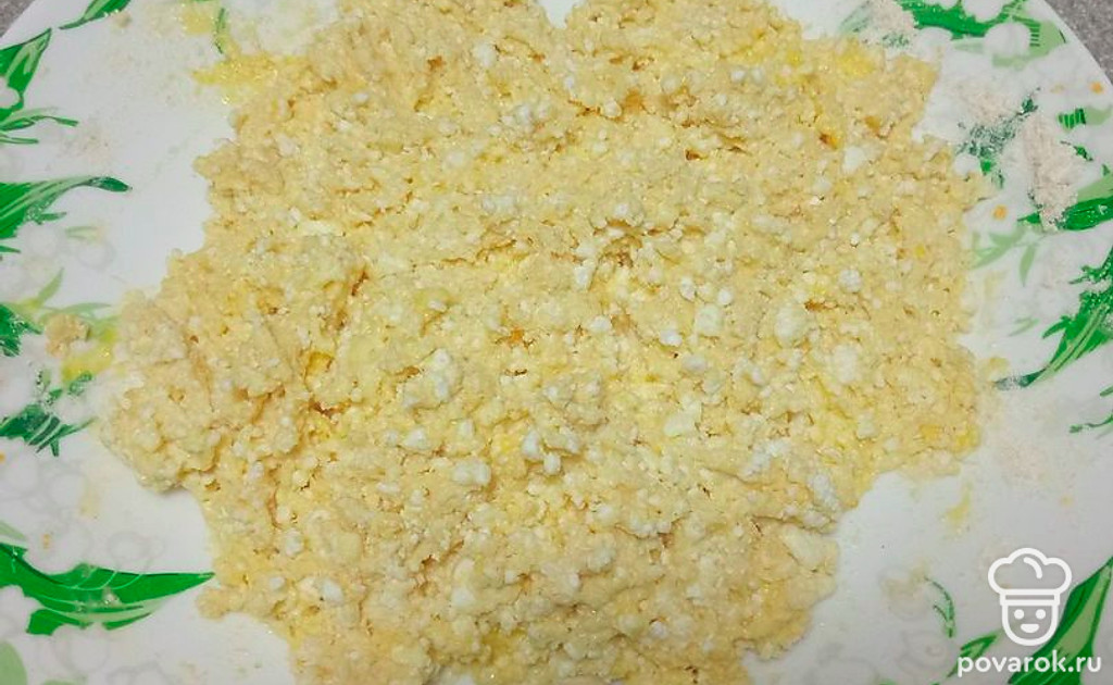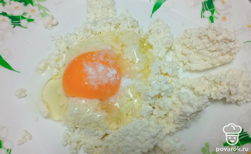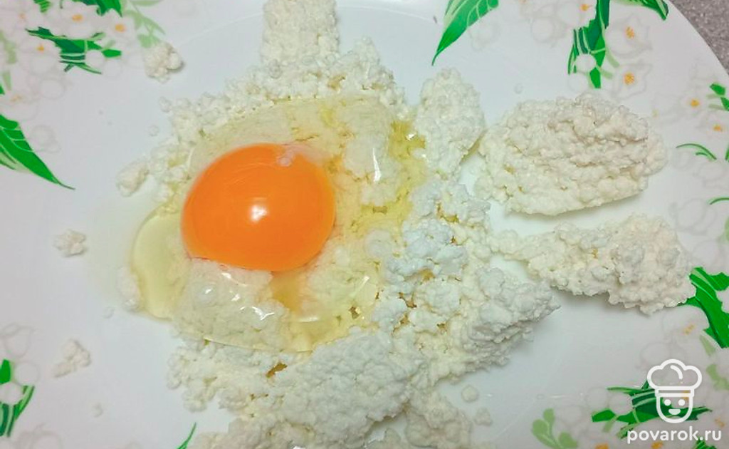 К творогу добавьте яйцо.