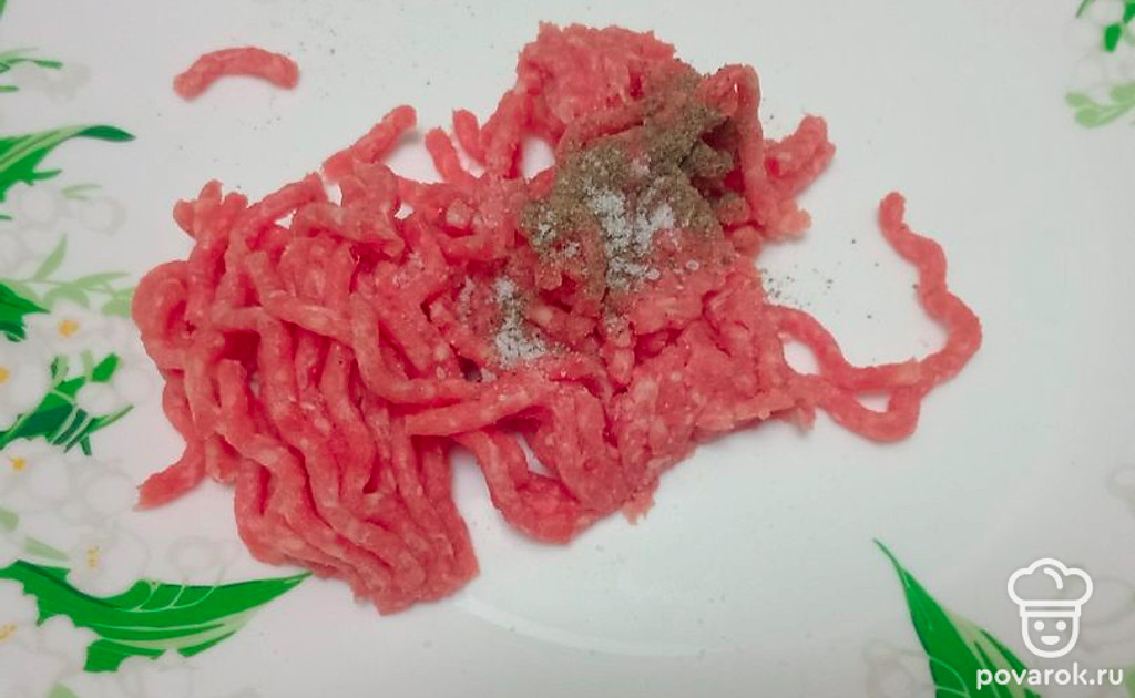 Смешайте говяжий фарш, черный молотый перец и щепотку соли.
