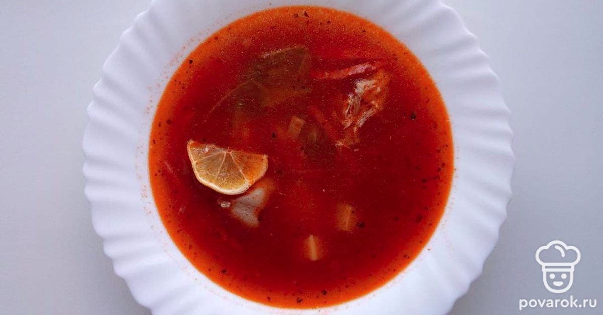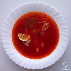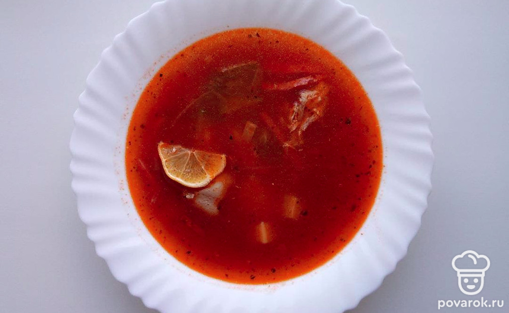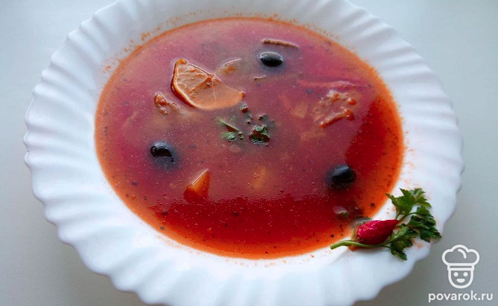 При подаче в тарелку налейте солянку и украсьте кусочком лимона и петрушкой.
