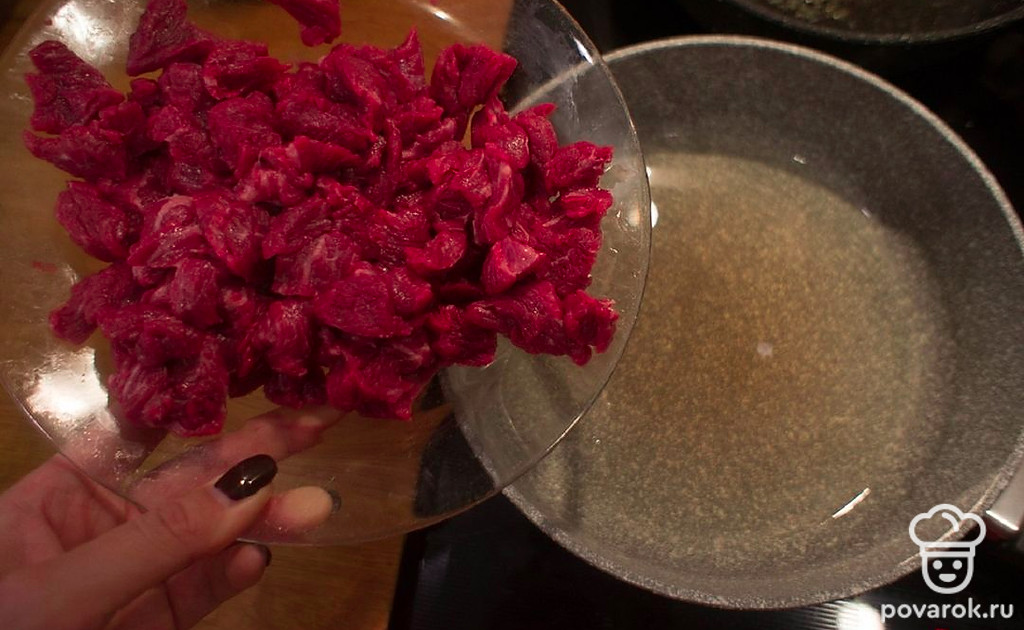 Мясо нарежьте кубиками (по возможности), срезав все прожилки и места с жиром.
