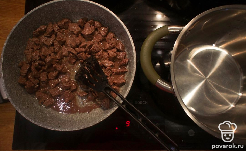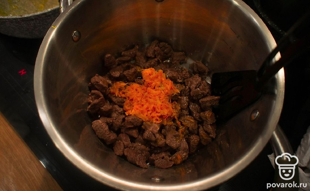 Когда обжарится мясо, переложите его в кастрюлю вместе с соком, которое выделилось из мяса.