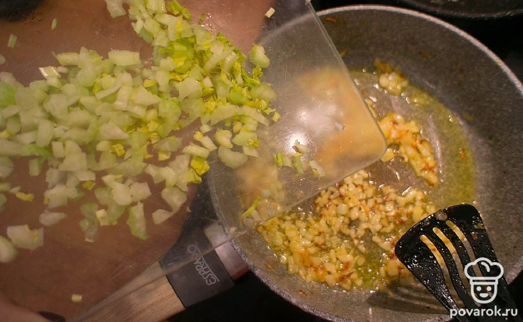 Добавьте сельдерей к луку и обжаривайте на среднем огне в течение пары минут. Переложите овощи в кастрюлю к мясу.