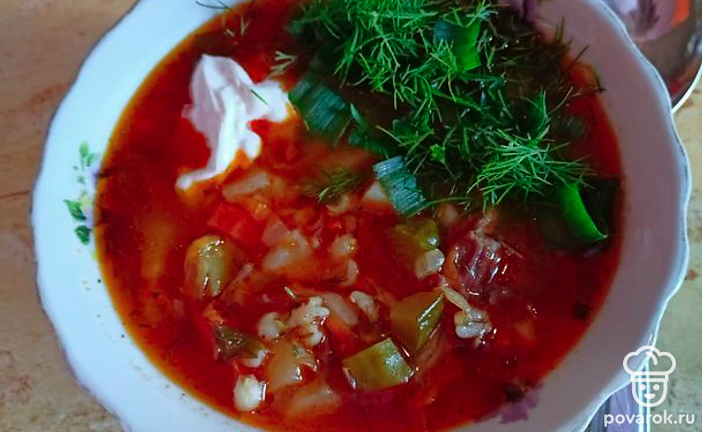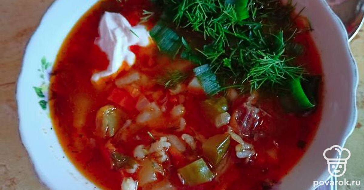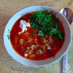 Очень вкусный супчик. Как и полагается, в его составе есть хороший кусок мяса (свинины или говядины), а ещё солёные огурцы. В общем получается наваристый бульон с овощами.
