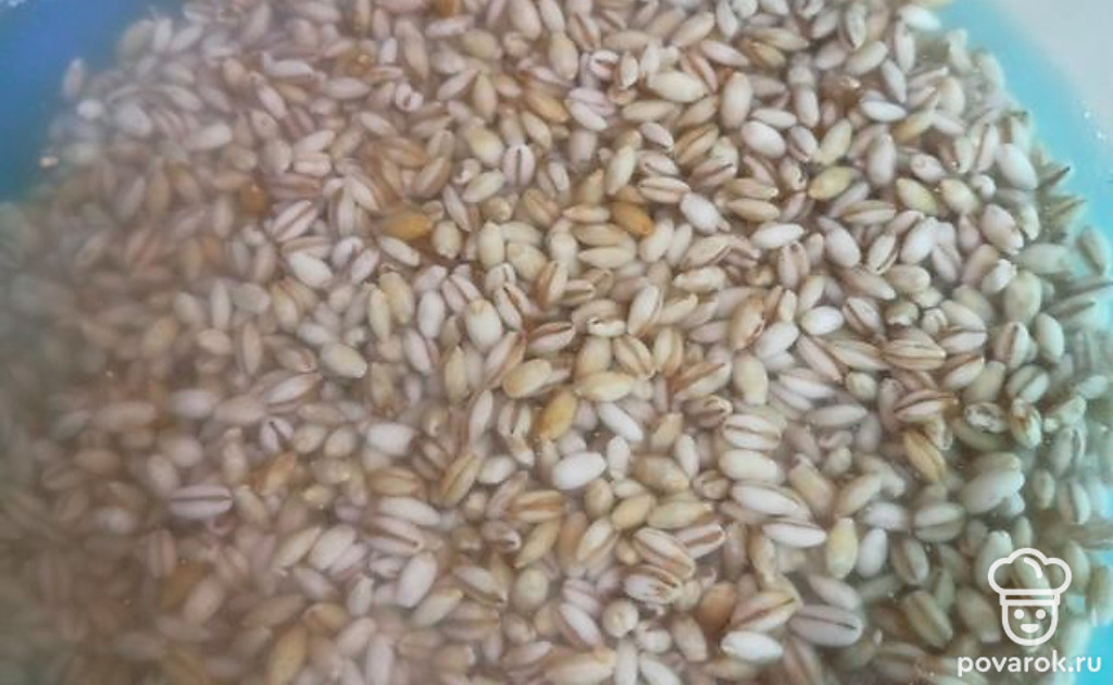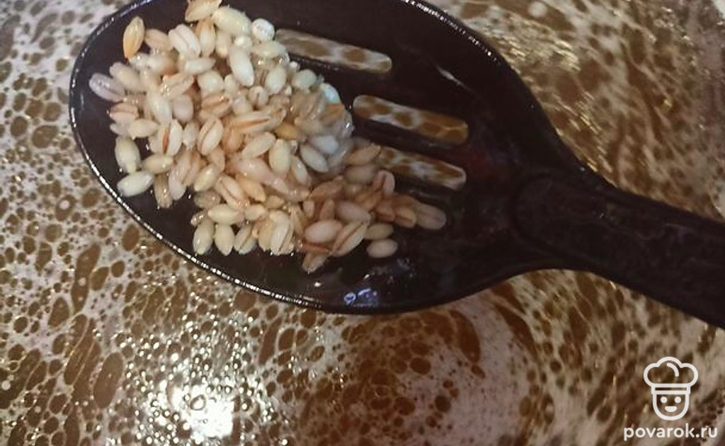 Пока мясо варится, замачиваем перловку: сначала перловку промыть под холодной водой, а затем заливаем водой и оставляем.