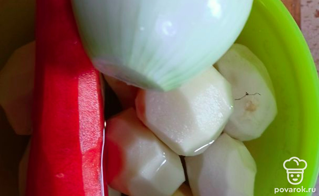 Почистить картошку, морковь и лук. Картофель порезать кубиками, морковь натереть на терке, лук мелко порезать.