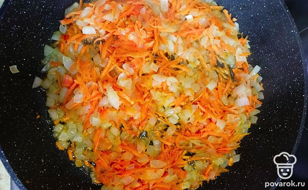 Обжариваем на сковороде в небольшом количестве растительного масла сначала лук до золотистого цвета, затем добавляем морковь. Жарим до готовности на медленном огне, постоянно помешивая.