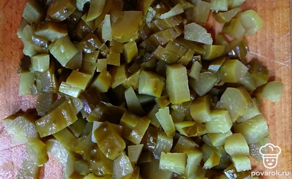 Огурцы режем на кубики, рассол оставляем, он нам пригодится в бульон.