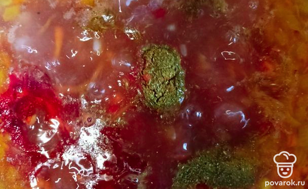 Добавляем нашу за жарку из лука и моркови, лавровый лист,зелень,специи по вкусу, огурцы и рассол из под огурцов. Рассол добавляем только в конце варки. Пробуем на соль, добавляем по вкусу. Проварить все 5 минут и выключаем огонь.