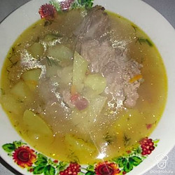 После того, как картошка сварилась, выкладываем в кастрюлю с картошкой мясо и зажарку, солим по вкусу.