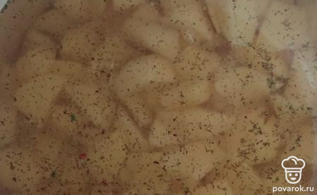 Чистим картошку, нарезаем, заливаем водой. Добавляем специи, ставим на плиту на 20-30 минут.