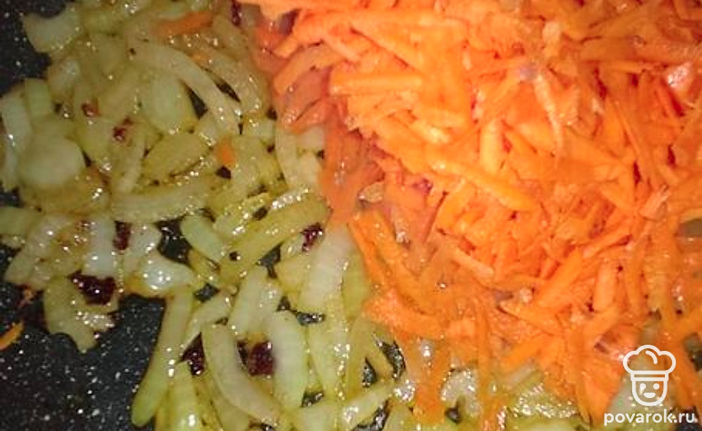 Обжариваем свинину на сковороде, приправляем специями. Выкладываем мясо из сковороды в тарелку и на этом же масле делаем зажарку из лука и моркови.