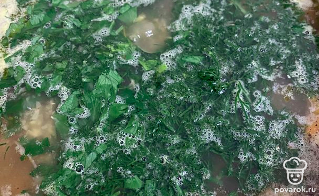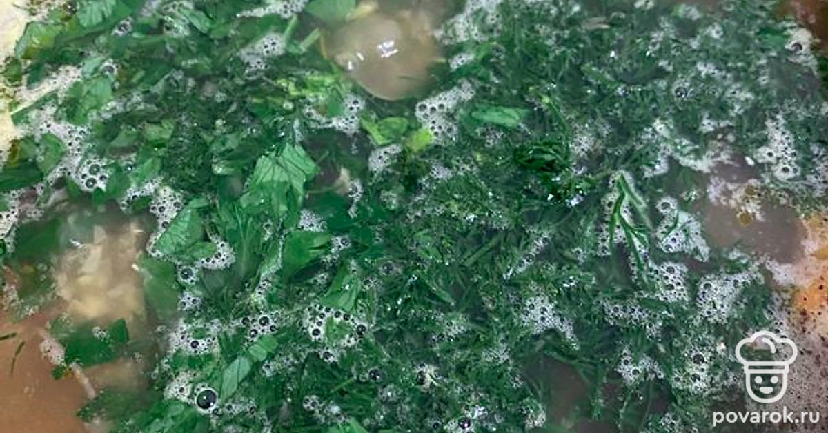 Варить 30 минут. За 5 минут до готовности добавить соль, перец, лавровый лист и рубленную зелень по вкусу.