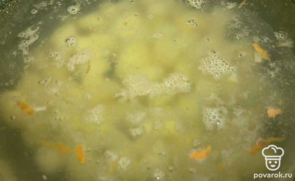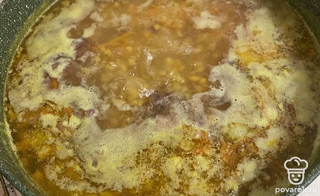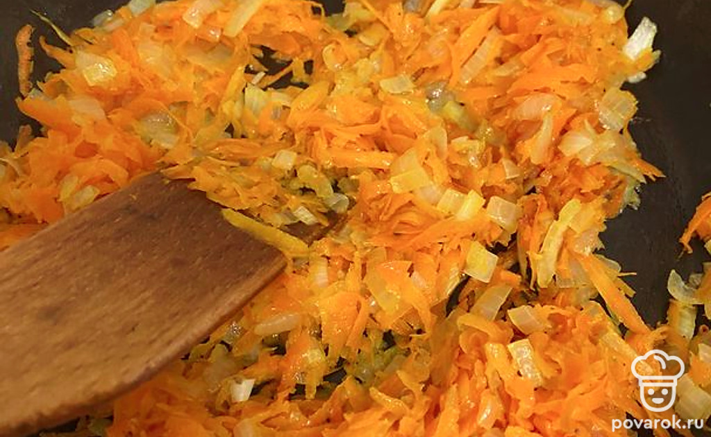 Чечевицу промыть и отправить к картофелю. Лук и морковь почистить, измельчить и слегка обжарить на сковороде.