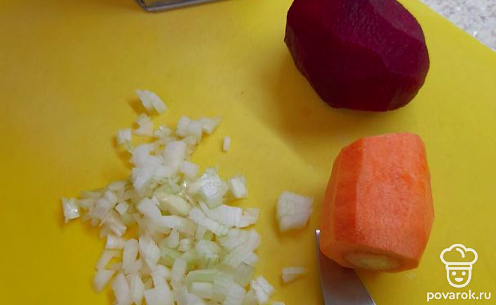 Варить бульон 1 час. Нарезать мелко лук, натереть на терке морковь и свеклу.