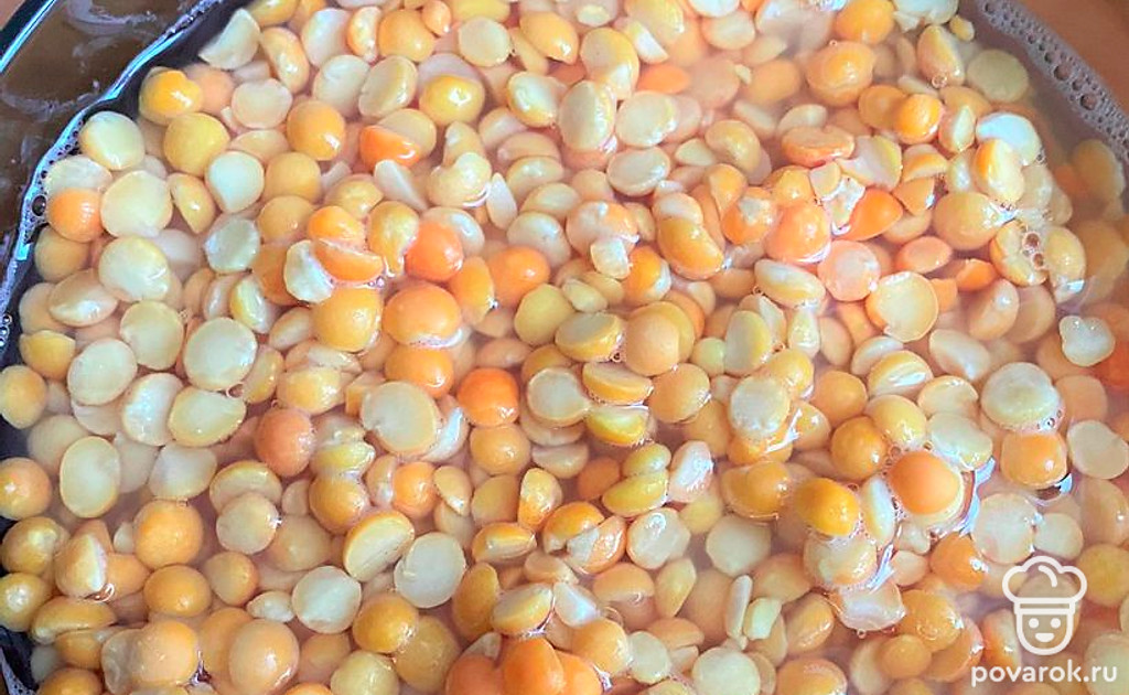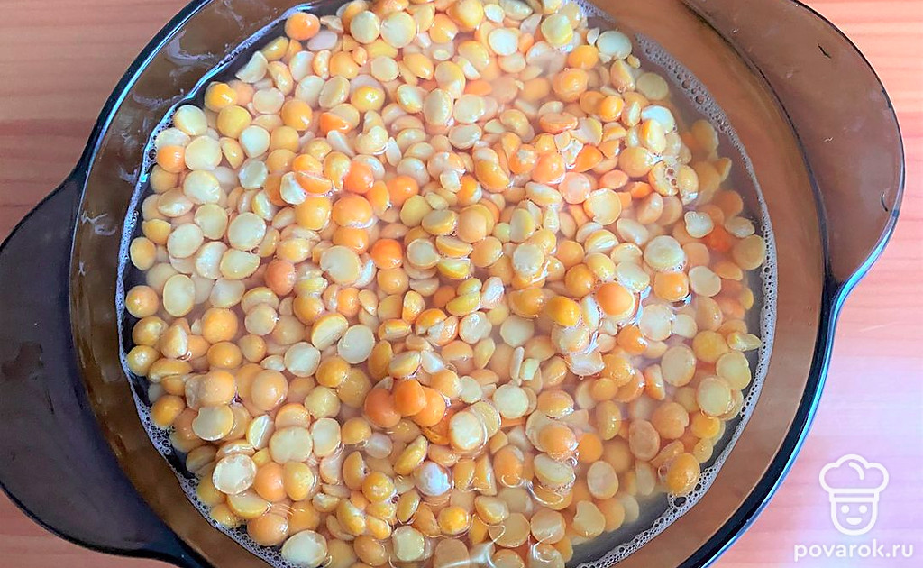 Предварительно промойте и замочите горох в воде. Замочить горох желательно заранее, тогда в течении 10-15 минут он будет готов. Если без замачивания, то надо варить до готовности не менее 40 минут.