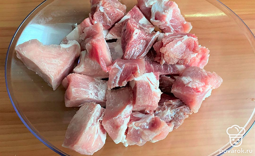 Мясо хорошо промойте холодной водой и нарежьте небольшими кусочками.