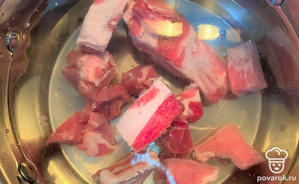 Положите мясо в кастрюлю, залейте водой и поставьте на средний огонь. Отварите мясо практически до готовности. При варке необходимо снимать пену. Вместо воды можете использовать бульон.