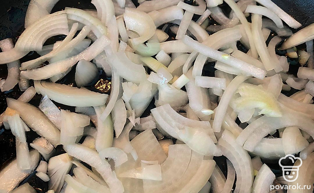 Нарежьте лук тонкими полукольцами. Отправьте лук на сковороду в разогретое масло и обжарьте до легкого румяного цвета.