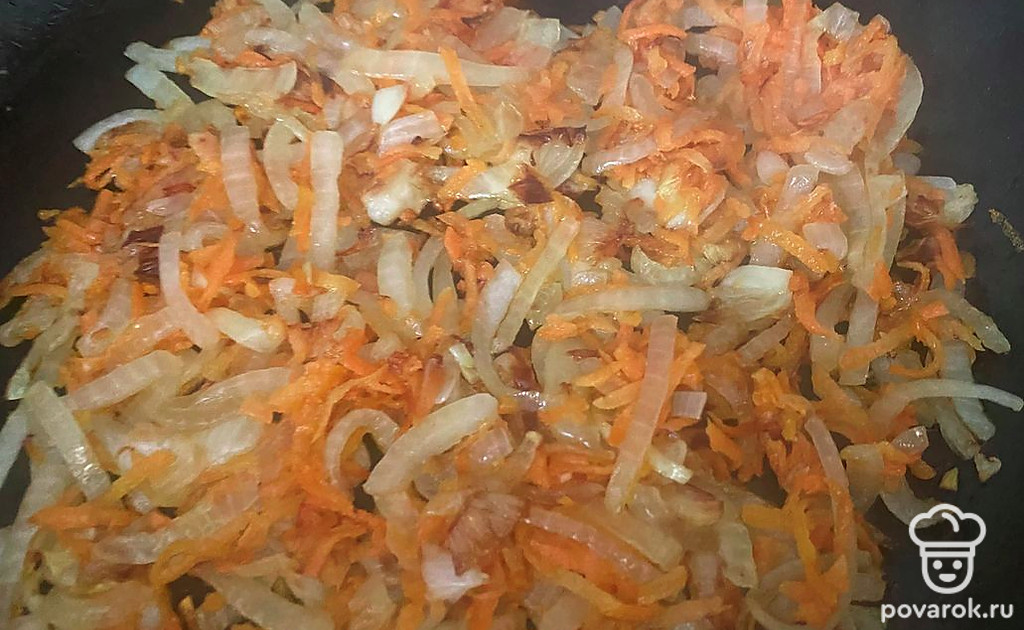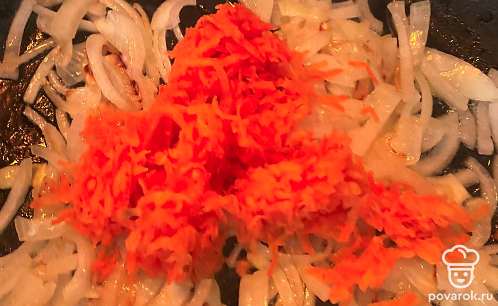 Отправьте к луку натертую морковь, соль и обжарьте морковь до мягкости на слабом огне. Зажарка готова.