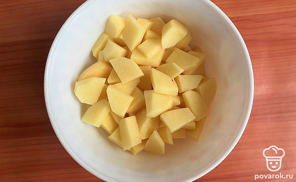 Помойте, очистите и нарежьте кубиками картофель. Отправьте его в суп за 15-20 минут до готовности.
