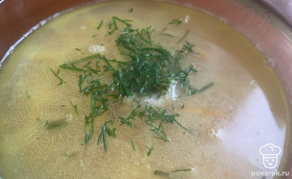В последнюю очередь к почти приготовленному супу переложите зажарку из лука и моркови. Оставьте суп вариться на медленном огне еще пару минут. Дайте блюду минут 10 настояться под прикрытой крышкой.