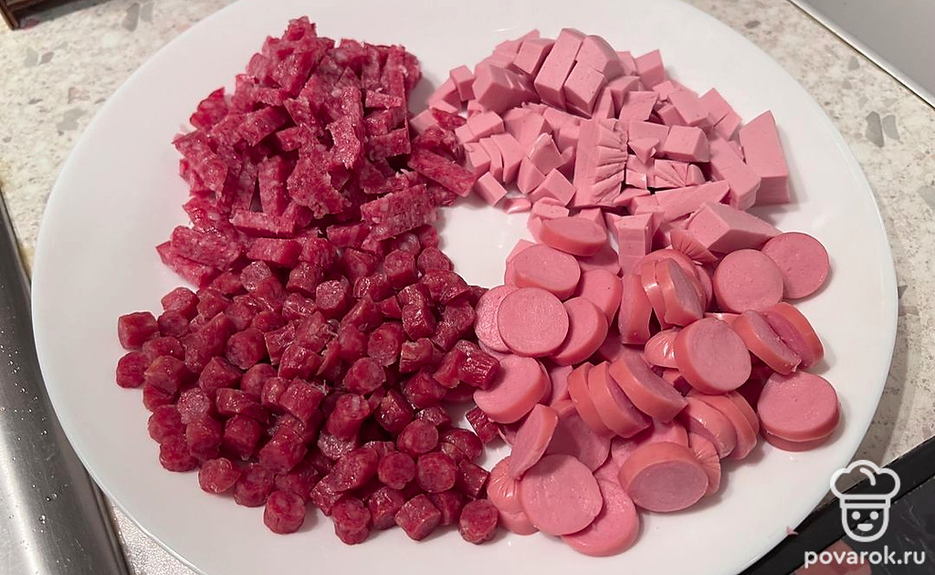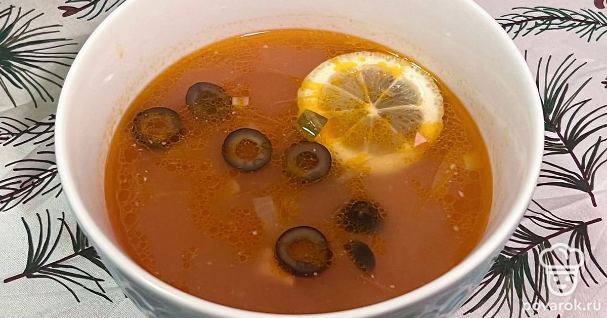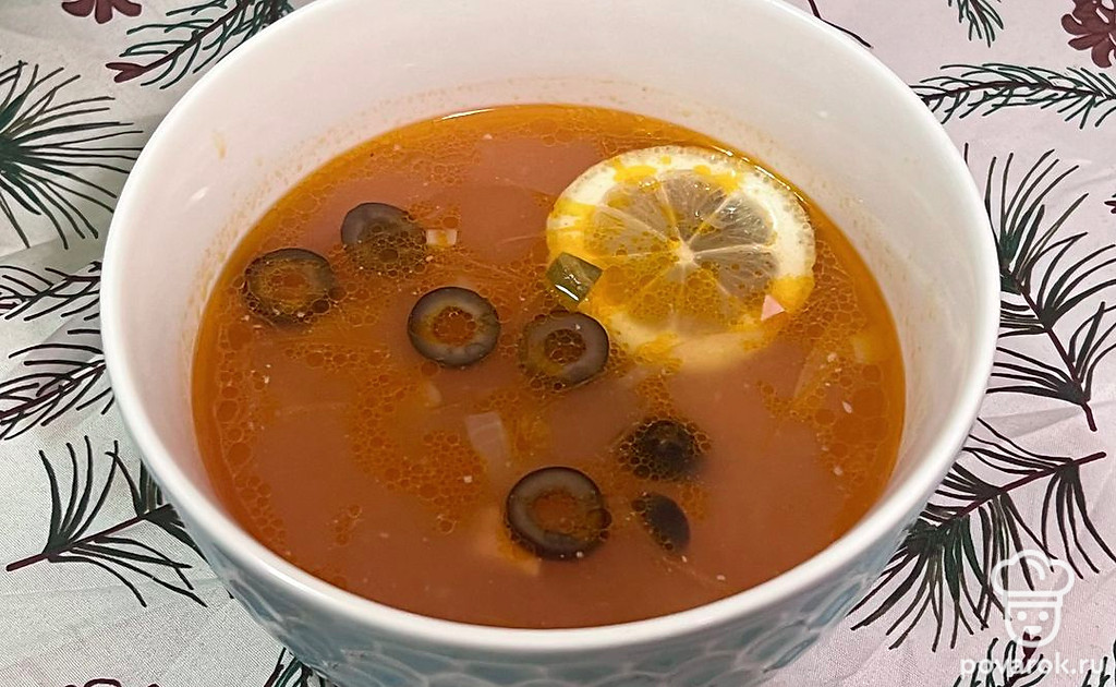Переложите в кастрюлю и варите 5 минут. Нарежьте оливки кольцами и добавьте в суп. Проверьте суп на вкус, при необходимости можно добавить огуречного рассола или просто соли.