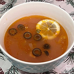 Солянка готова. Добавляем дольку лимона и наслаждаемся.
