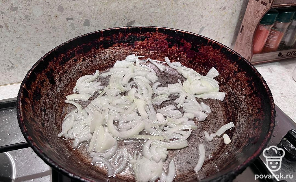 Нарежьте лук четверть-кольцами и обжарьте его на масле 2-3 минуты, чтобы лук стал мягким.