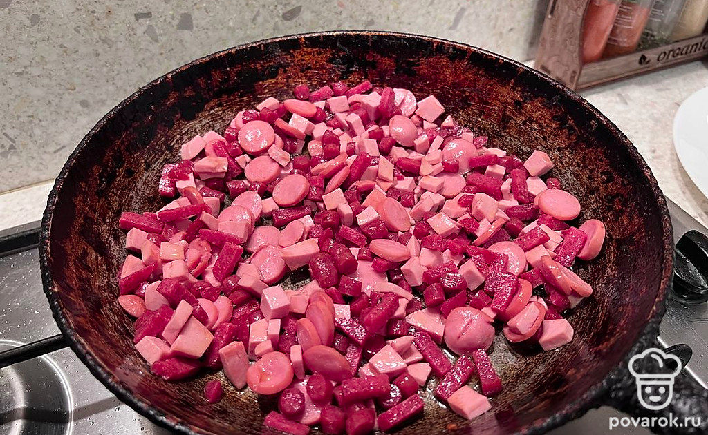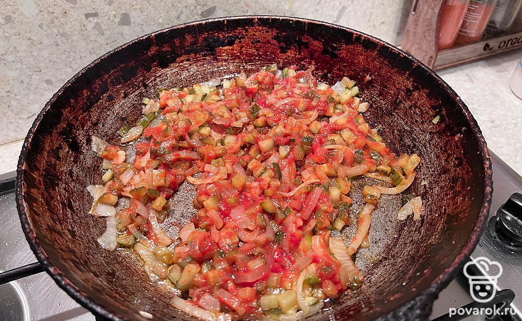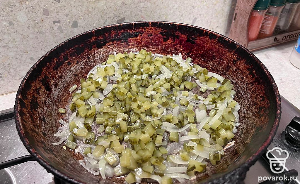Соленые огурцы нарежьте мелким кубиком, отправьте к луку и жарьте 2 минуты.