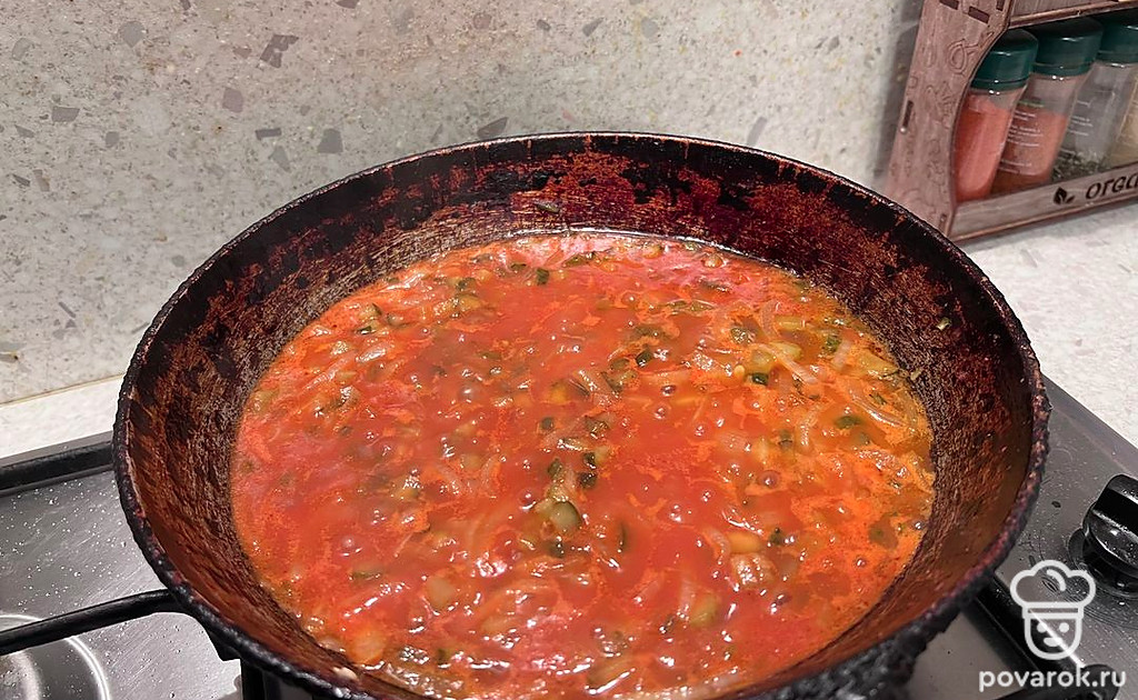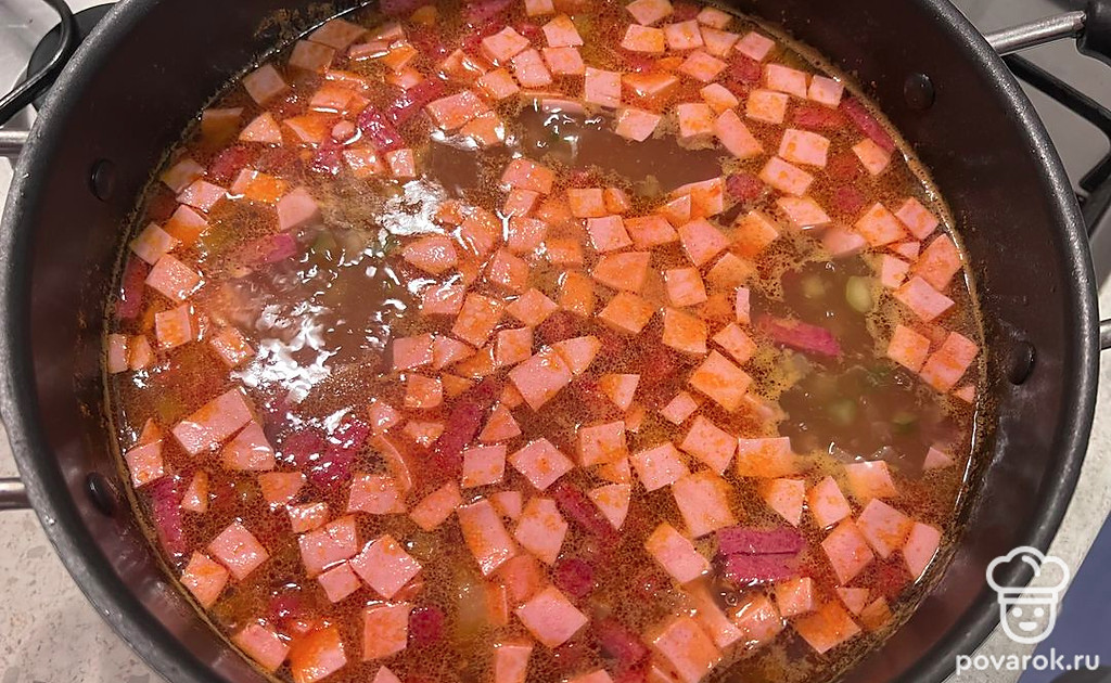 Залейте водой, добавьте 1 чайную ложку сахара, тушите 5 минут. Перелейте все в кастрюлю с кипяченой водой или бульоном.