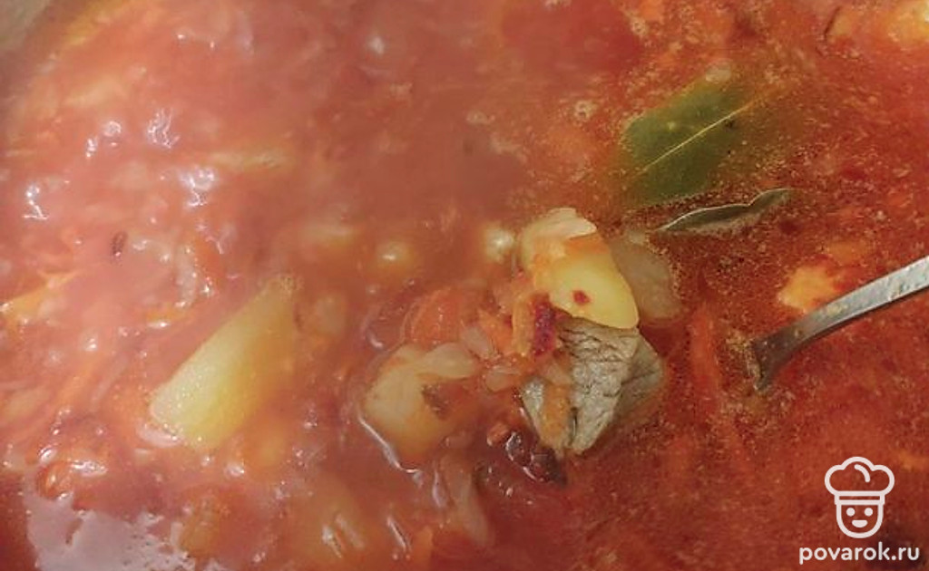 Борщ готов, можно подавать с чесноком, черным хлебом и сметаной.