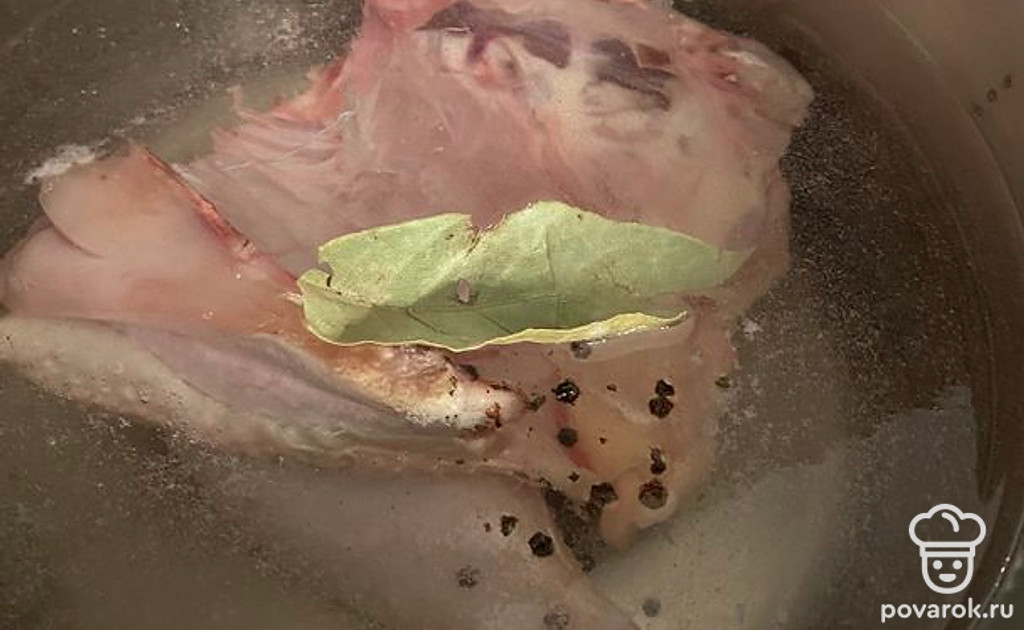 Положите в воду индейку, лавровый лист, перец горошком и поставьте на средний огонь.