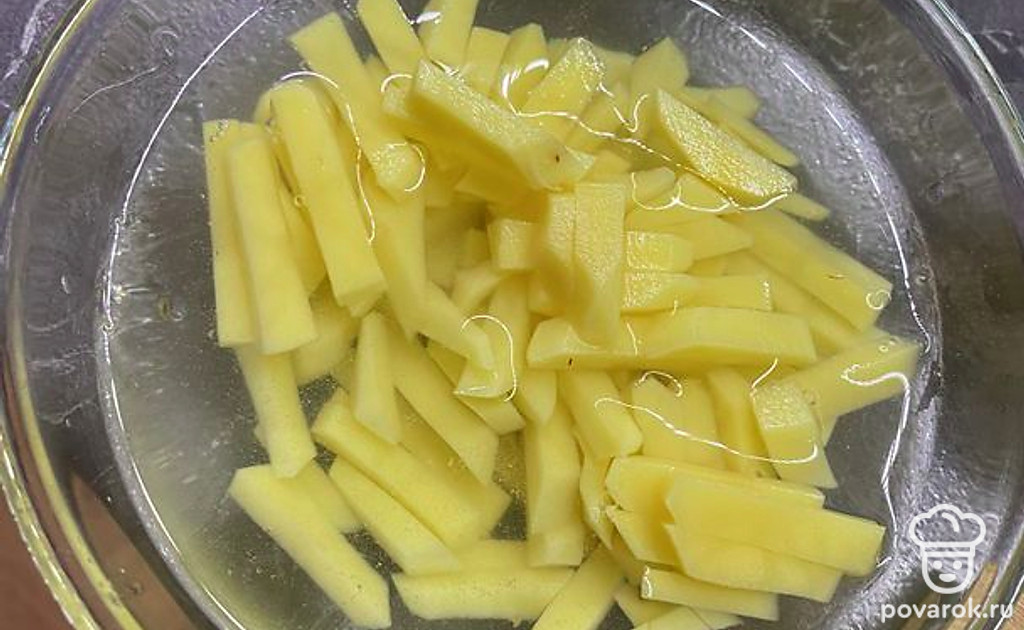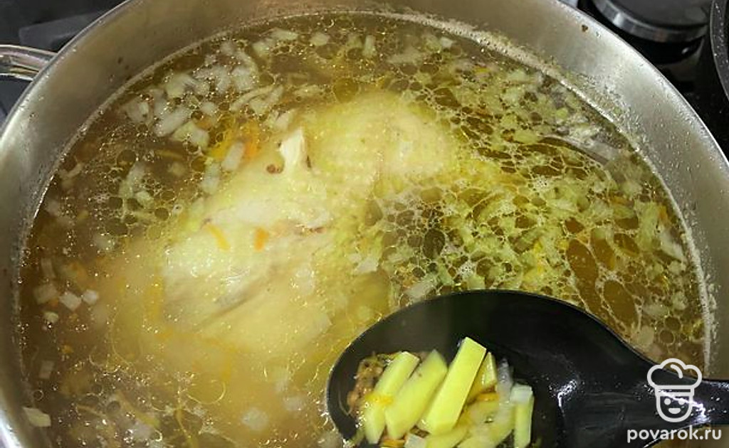 Соломкой нарежьте картошку и тоже добавьте суп.