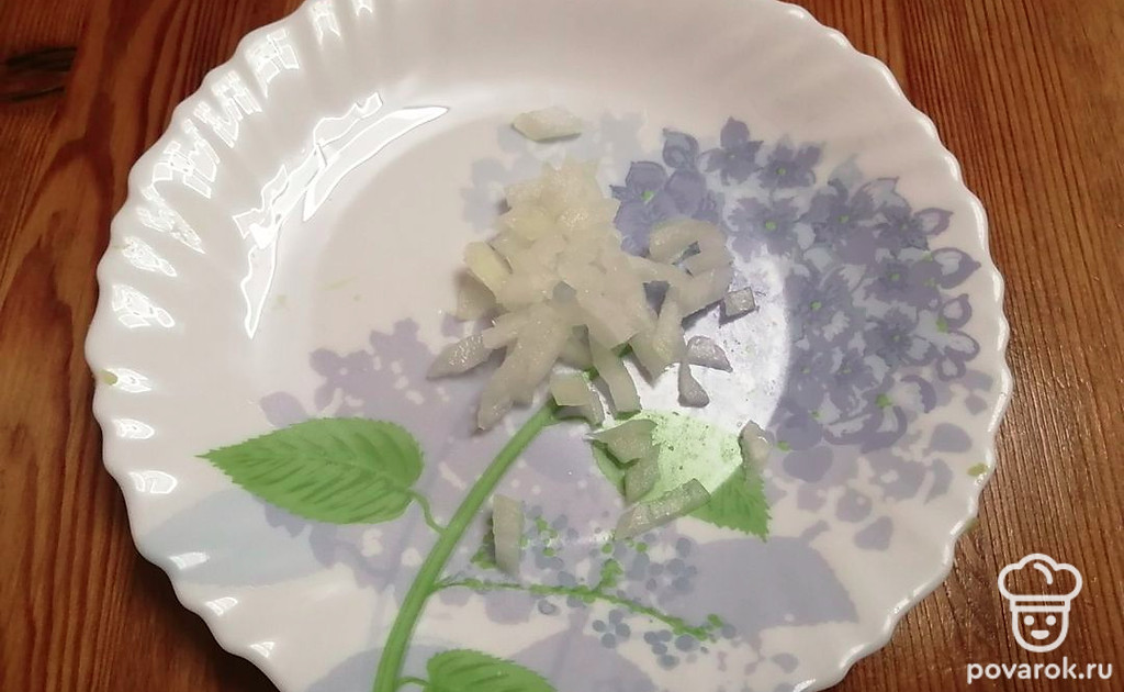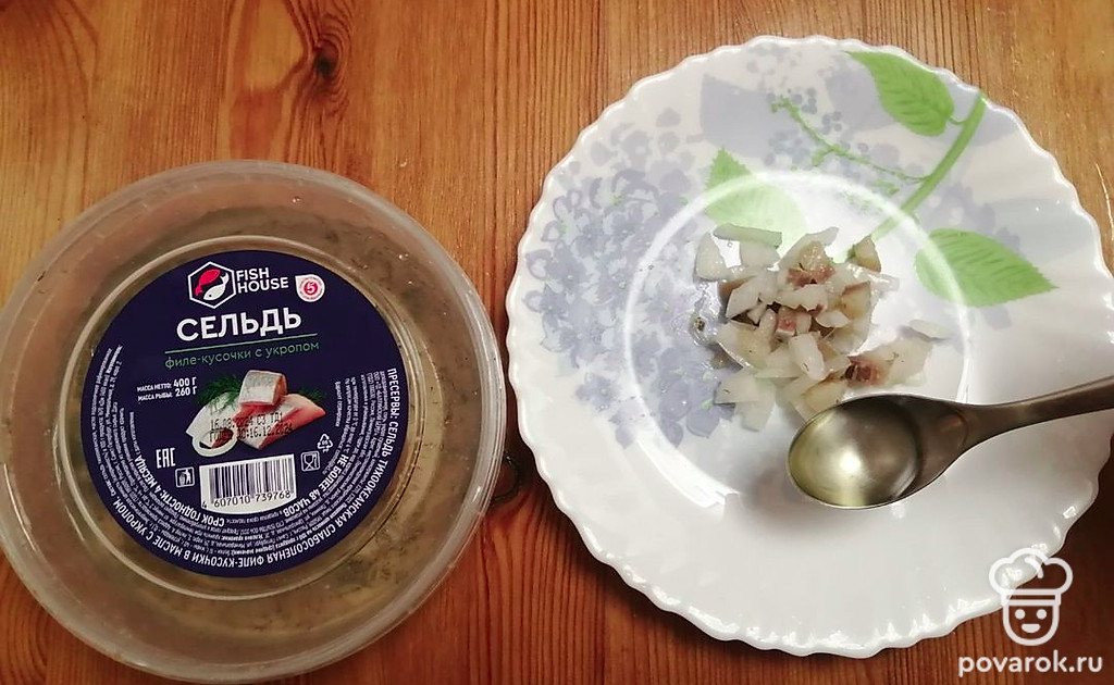 Слабосоленое филе селедки нарежьте небольшими кубиками.