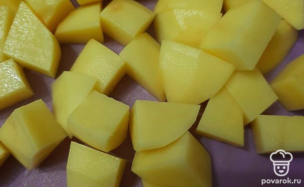 Отвариваем мясо до готовности. Затем промываем, режем средним кубиком картофель и морковь и добавляем в кастрюлю к мясу.