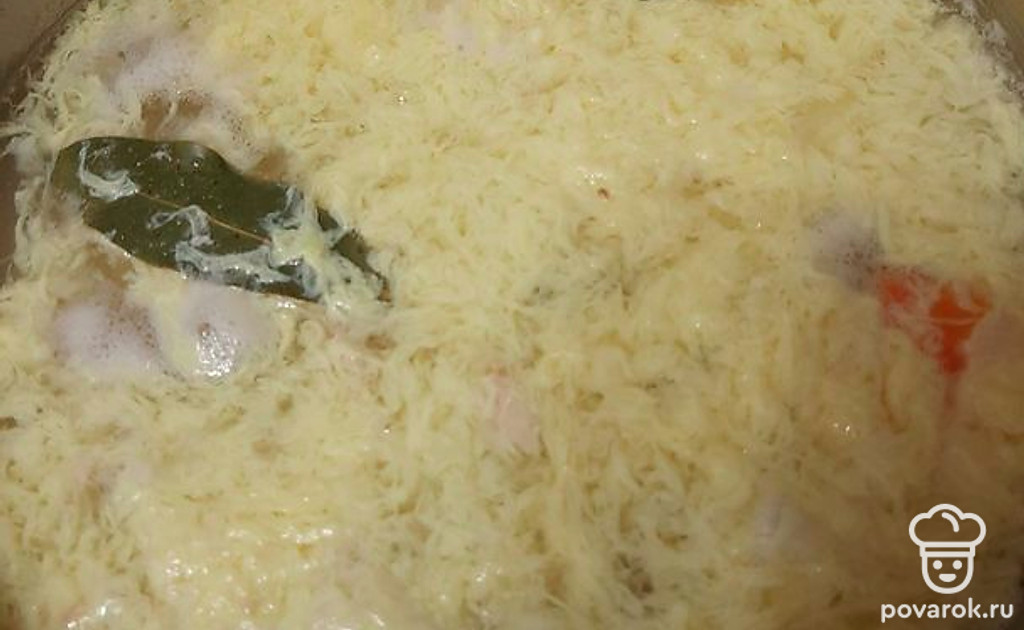 В кастрюлю добавляем соль по вкусу, лавровый лист, обжареный лук и взбитые яйца.