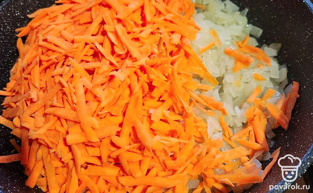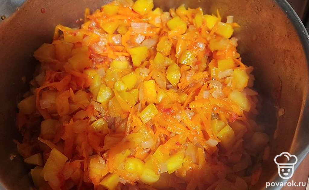 Репчатый лук нарежьте, обжарьте на растительном масле до золотистого цвета. Добавьте тертую морковь. Обжаривайте еще 5 минут. Помидоры очистите от кожуры и натрите на терке. Добавьте к овощам, тушите еще 5 минут.