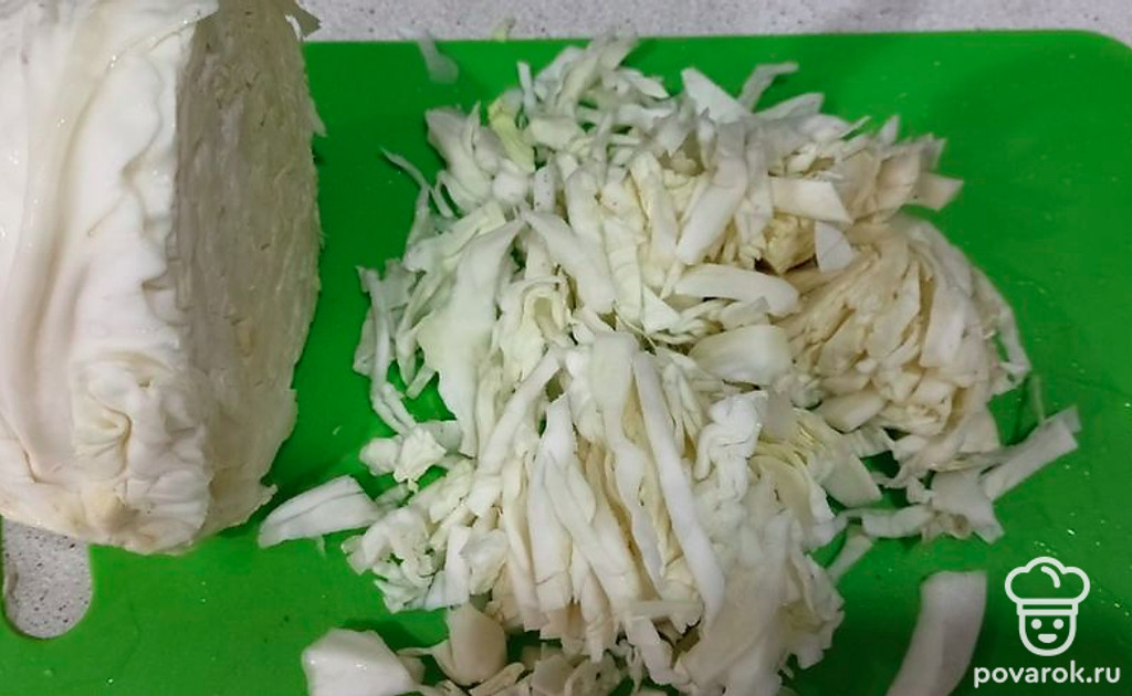 Шинкуем капусту и добавляем в кастрюлю.