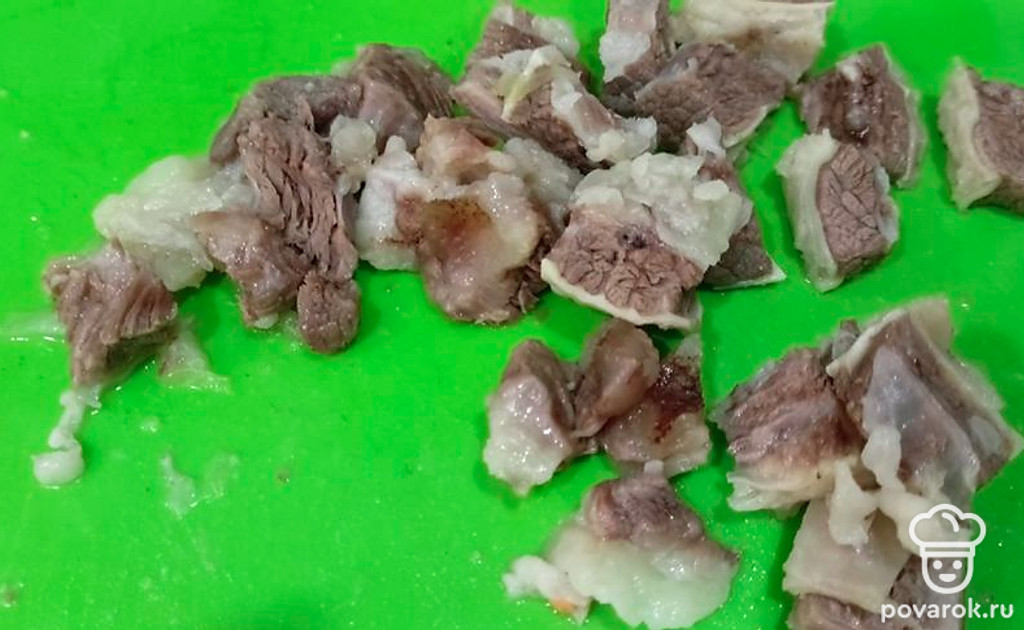 Как мясо станет мягким, достаем и нарезаем кубиками, далее кладем обратно в кастрюлю.