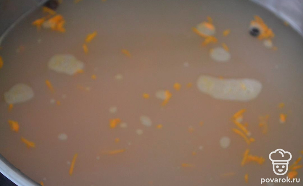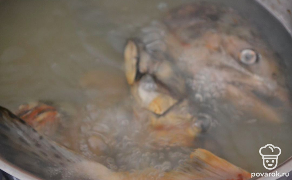 Через 2 часа после начала готовки рыбу достаем из кастрюли, бульон процеживаем через сито. После чего добавляем лук и морковь.