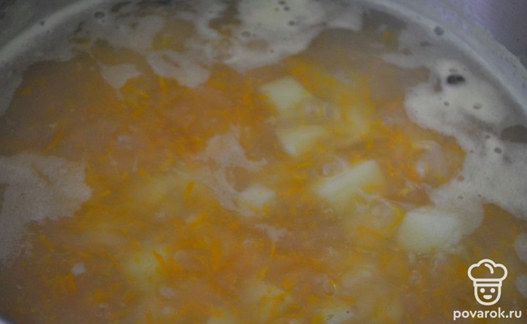 Картофель добавляем в кастрюлю через 10-15 минут после того, как мы добавили морковь и лук. Как только картофель готов, огонь отключаем и оставляем уху на плите на 15-20 минут.