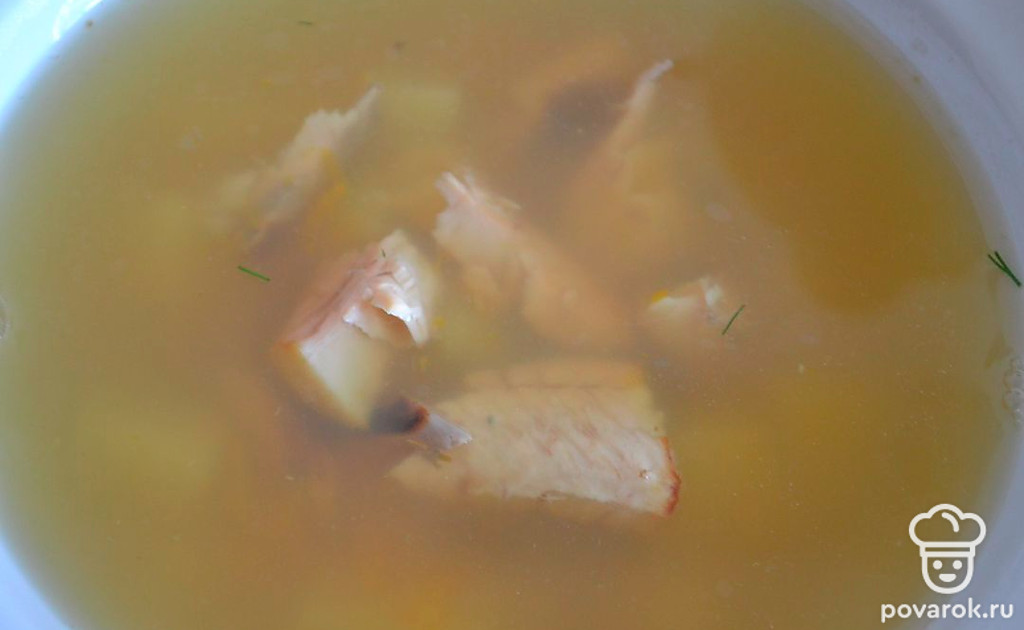 Разливаем уху по тарелкам. Рыбу чистим, добавляем кусочки рыбы в каждую тарелку. Солим по вкусу.