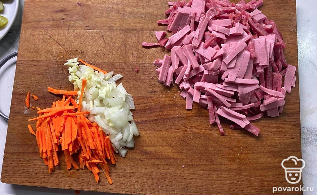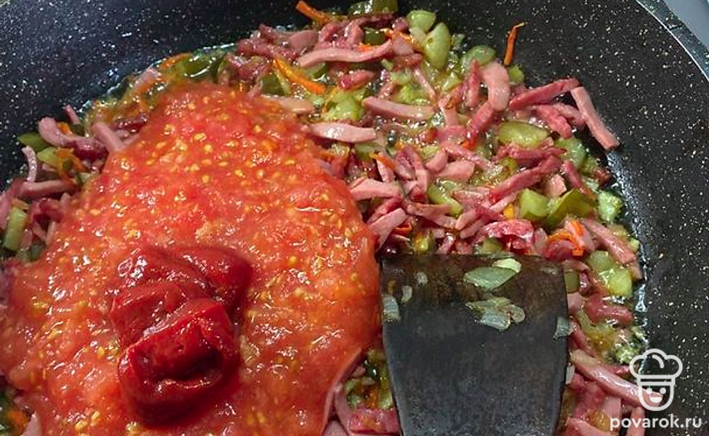 Затем добавляем колбасу, огурец, помидор и 2 столовые ложки томатной пасты. Жарим минут 5.