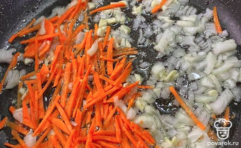 Ставим жарить лук, морковь и чеснок на медленный огонь.