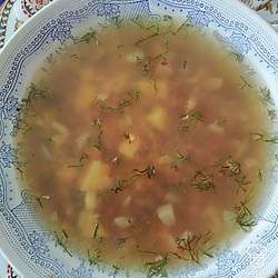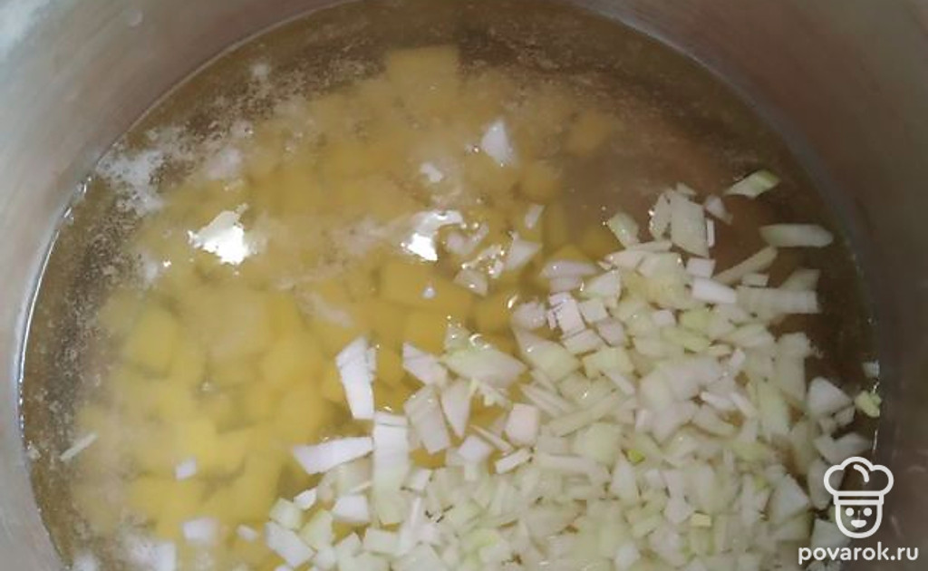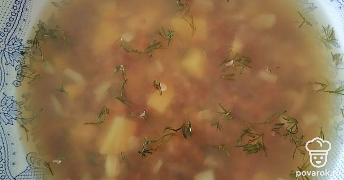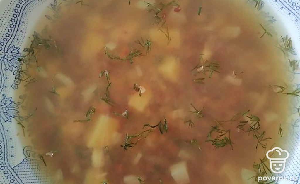 Гречку промыть, убрать мусор. Положить в бульон. Суп варить до готовности.