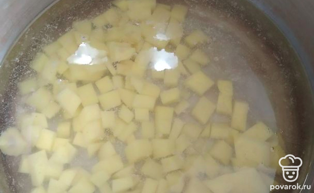 В кастрюлю налить воды, положить картошку, поставить на средний огонь.