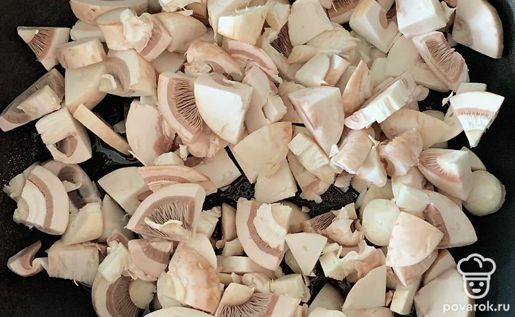 Грибы нарезаем и отправляем обжариваться на сковородку.