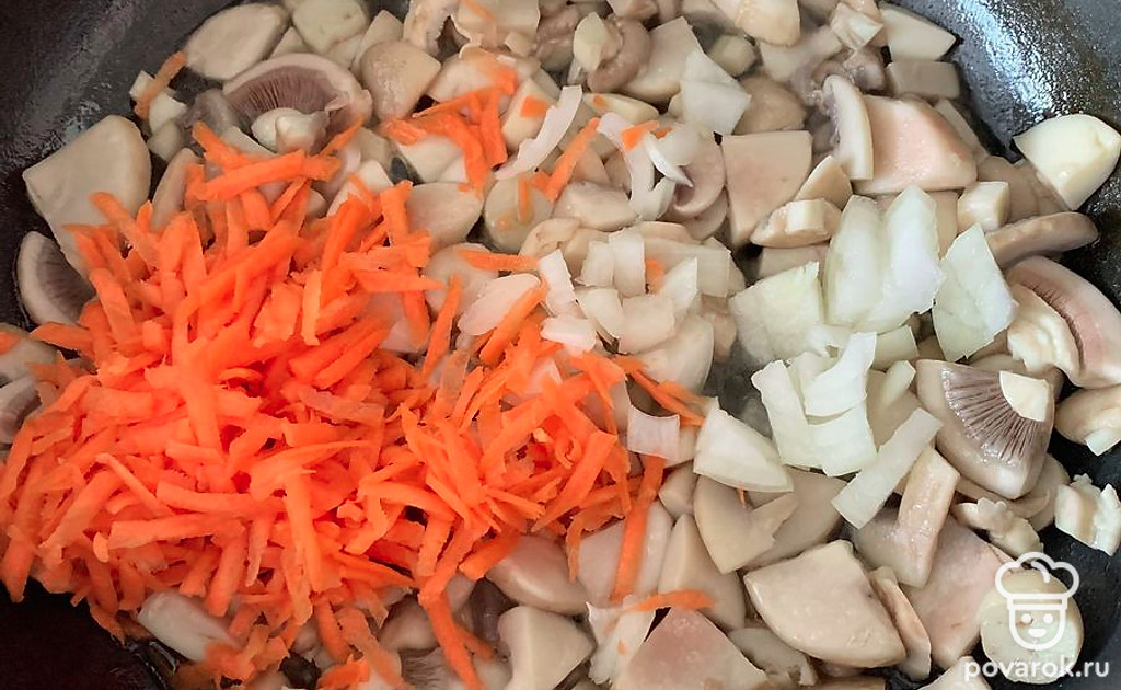 К грибам добавляем лук и тертую морковь.