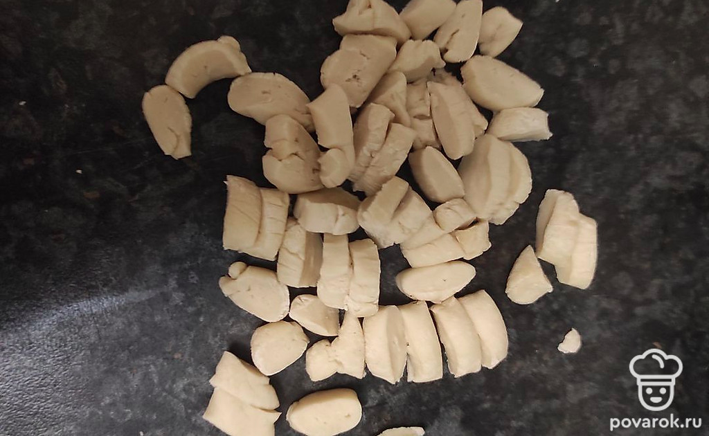 Пока курица варится, приготовить галушки. Смешать яйцо, муку, воду, посолить и вымесить тугое тесто. Раскатать в тонкую колбаску и нарезать.
