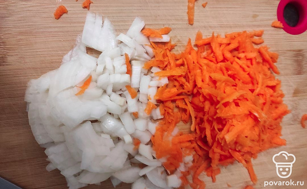 Лук нашинковать кубиками, морковь натереть на крупной терке. Приготовить зажарку, обжарив овощи на растительном масле до мягкости.